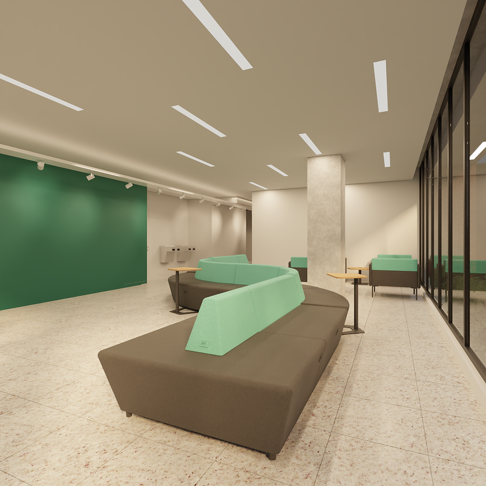A fachada do edifício reflete uma cuidadosa escolha de materiais, como o tijolinho e o quartzo branco, integrando-se à paisagem histórica da Avenida dos Andradas. Jardineiras com caixas de captação promovem sustentabilidade, enquanto áreas permeáveis totalizam 728,28 m². Internamente, a iluminação e ventilação naturais são otimizadas pelo uso moderado de vidro, exceto no quarto pavimento, que exibe vidro como revestimento externo. Este projeto é uma síntese entre a valorização do entorno histórico e o compromisso com a modernidade, destacando-se como um marco arquitetônico para Belo Horizonte.