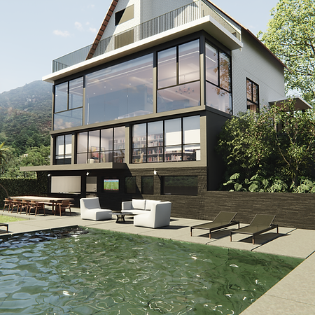 A organização dos ambientes privilegia a integração das áreas sociais, com sala de estar, jantar e cozinha conectadas visualmente e funcionalmente, permitindo diferentes usos ao longo do dia. A escada assume papel central no projeto, funcionando como elemento de transição e articulação entre os pavimentos, com desenho preciso e leveza estrutural. As esquadrias amplas emolduram a vista e favorecem a entrada de luz natural, reforçando a sensação de amplitude e continuidade espacial.